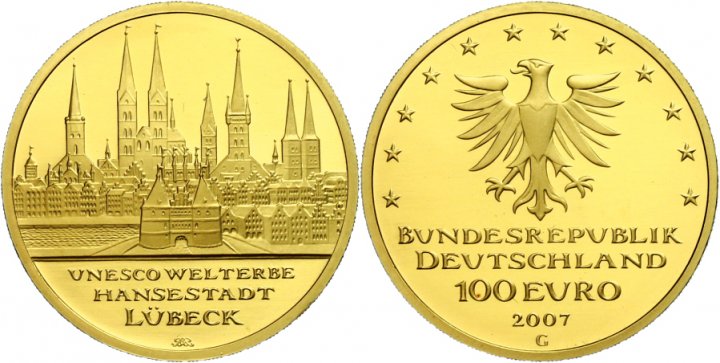 Seit dem Jahr 2002 werden jährlich, mit wechselnden Motiven 100-Euro-Goldmünzen zu je ½ Unze fein (15,55g) geprägt. Die in fünf Prägestätten (A, D, F, G und J) geprägten Gedenkmünzen werden mit einem Zertifikat und einer schwarzen Schatulle ausgeliefert. Da die Auflage der beliebten 100-Euro–Münzen sehr hoch ist (pro Prägestätte 40.000-100.000 Stück), werden diese mehr oder weniger nahe des Goldpreises gehandelt.