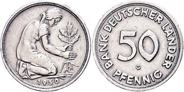 Bis auf einige wenige Fehlprägungen, ist dieses 50-Pfennig-Stück mit der Umschrift »BANK DEUTSCHER LÄNDER« und dem Prägebuchstaben »G« (Karlsruhe) des besonderen Jahres 1950, die am häufigsten vorkommende »Fehlprägung« und in Wirklichkeit die einzig wirklich wertvolle, reguläre Umlaufprägung aller 50-Pfennig-Stücke. Die Auflage dieses Typs wird auf 30.000 Stück beziffert. Trotz der relativ geringen Auflage ist es heute kein Problem mehr eine solche Münze in sammelwürdiger Erhaltung für 150, — bis 250, — Euro im Fachhandel zu erwerben.