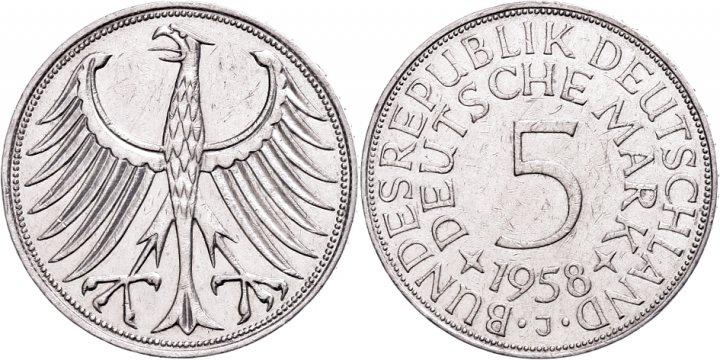 5-Mark-Stück des Jahres 1958 mit dem Prägebuchstaben J