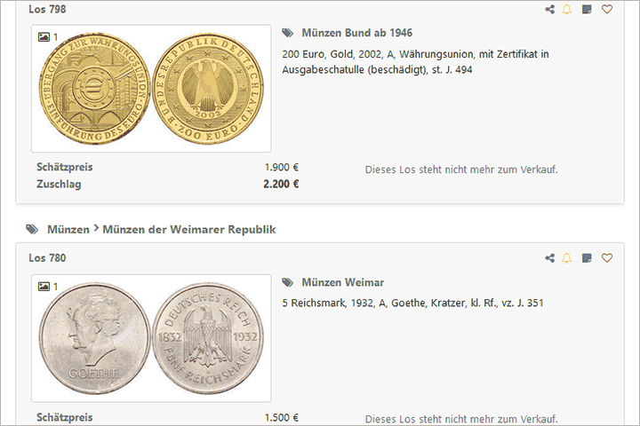 You can browse the lots of our current auction in the online catalog, which contains a high-performance search engine and online bidding functionality.